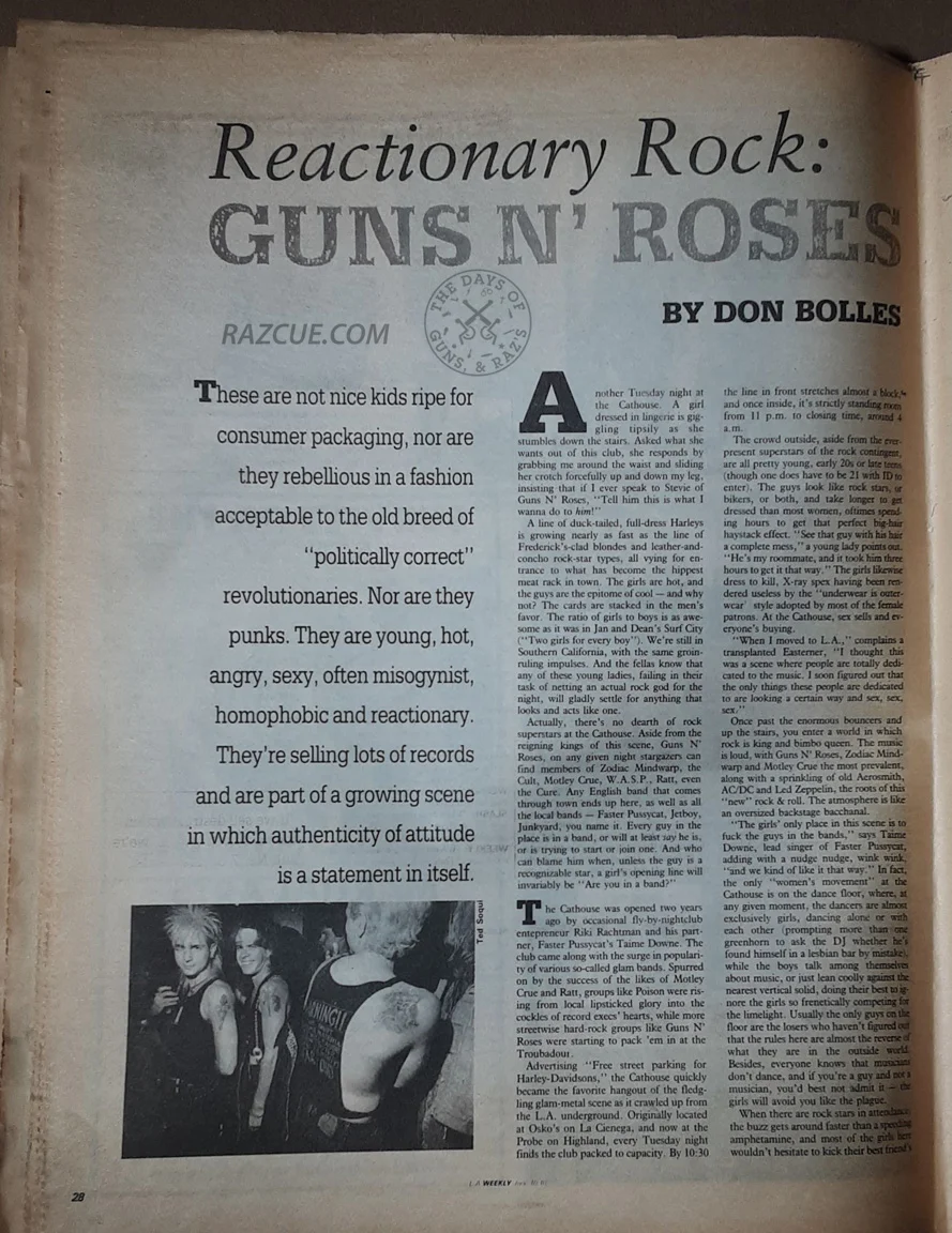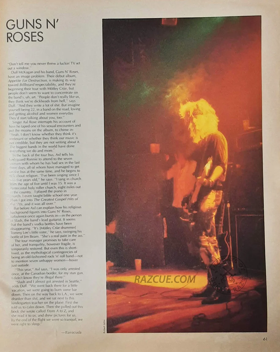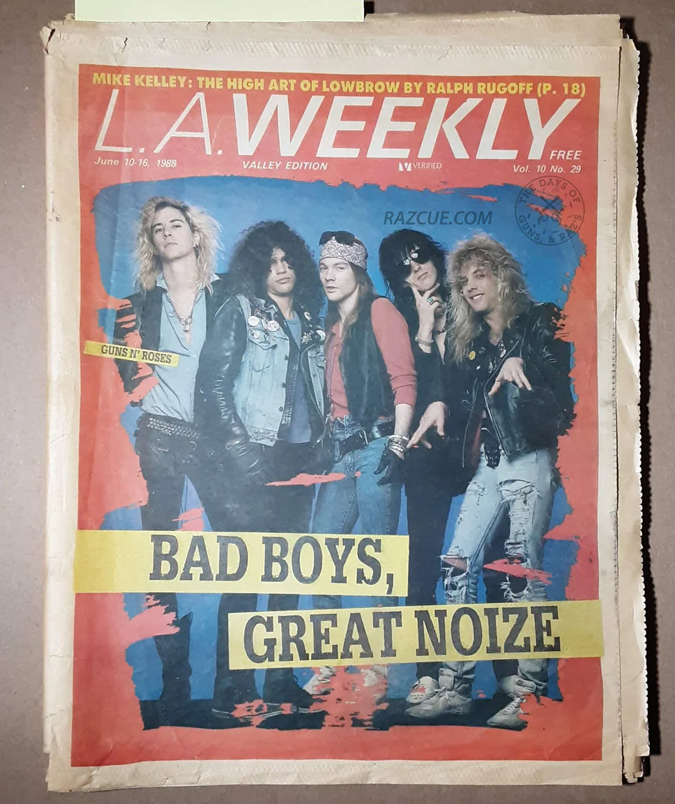 Axl was there with road manager Doug, who eventually became their business manager. When we were introduced, he said to me, “Raz, good to finally meet you.” He paused momentarily, seemingly pondering something, and then said, “You know who was asking about you the other day?” I perked up, feeling important about him knowing who I was, and that folks were talking about me. But he just chuckled and said, “No one.” At some point during my trip, Doug pointed out something that ruined some of my most cherished private moments. He said, “You know what I hate most? Those phone sex ads in the back of Hustler – the little ones with thirty on the page – I hate that they always sneak in one or two gay phone sex ads.”
