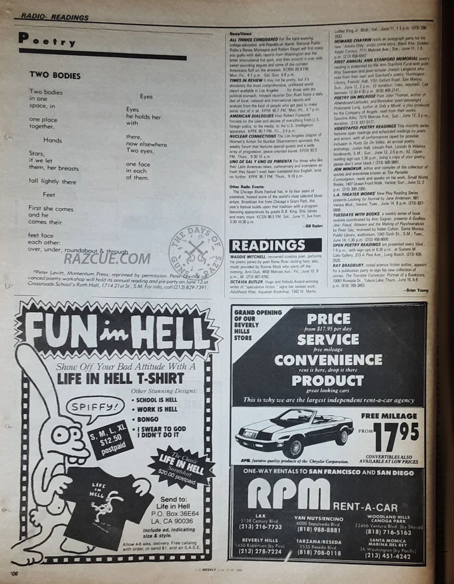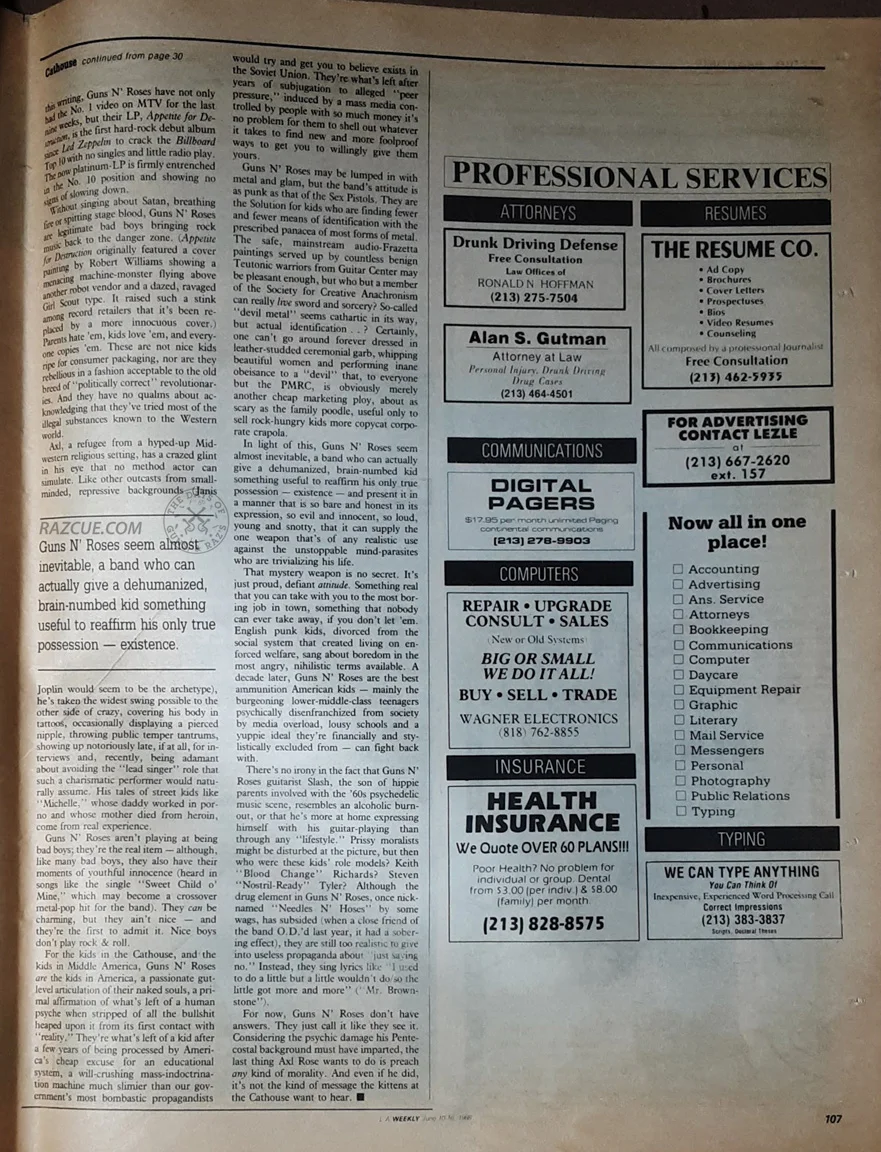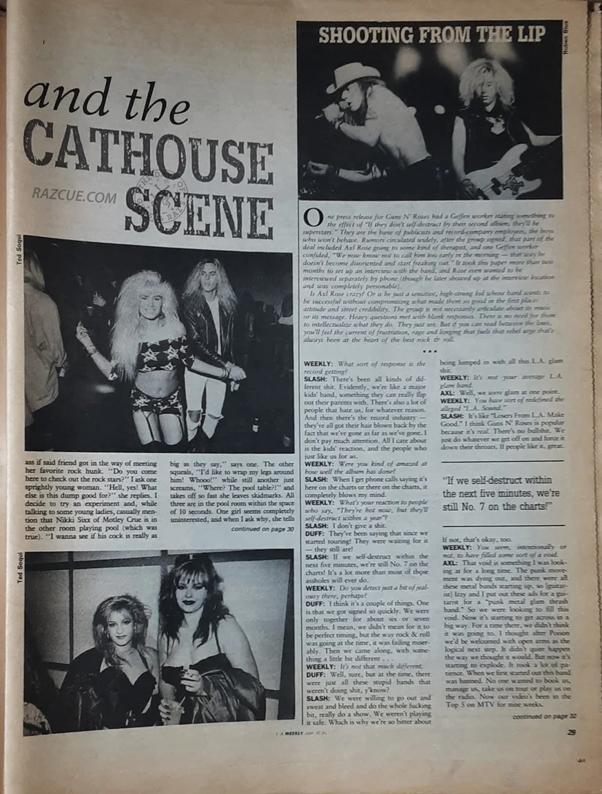 Axl was there with road manager Doug, who eventually became their business manager. When we were introduced, he said to me, “Raz, good to finally meet you.” He paused momentarily, seemingly pondering something, and then said, “You know who was asking about you the other day?” I perked up, feeling important about him knowing who I was, and that folks were talking about me. But he just chuckled and said, “No one.” At some point during my trip, Doug pointed out something that ruined some of my most cherished private moments. He said, “You know what I hate most? Those phone sex ads in the back of Hustler – the little ones with thirty on the page – I hate that they always sneak in one or two gay phone sex ads.”