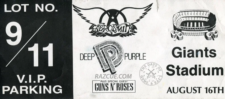 We got to Giants Stadium a few hours before sound check. I already had an all-access Guns N’ Roses laminate pass that I made myself using the cover from an AFD cassette’s artwork. But lots of people had realized that scam since I last went to a show, and so they designed new laminates consisting of Slash’s Sharpie drawing of two retarded dogs fucking. Actually, I can’t remember the image, because I never got one of those. Instead, I got one specific to that gig, with logos of Aerosmith, Deep Purple, and G N’ R. We were the first ones there, so Duff took me for a golf-cart tour of the parking lot. We zoomed around for a while until someone recognized him. Then, everyone recognized him and we hightailed it back behind the safety of the storm fence. Duff rewarded those fans who ran all the way to the gate by chatting, thanking people for the love, and signing a bunch of autographs.
