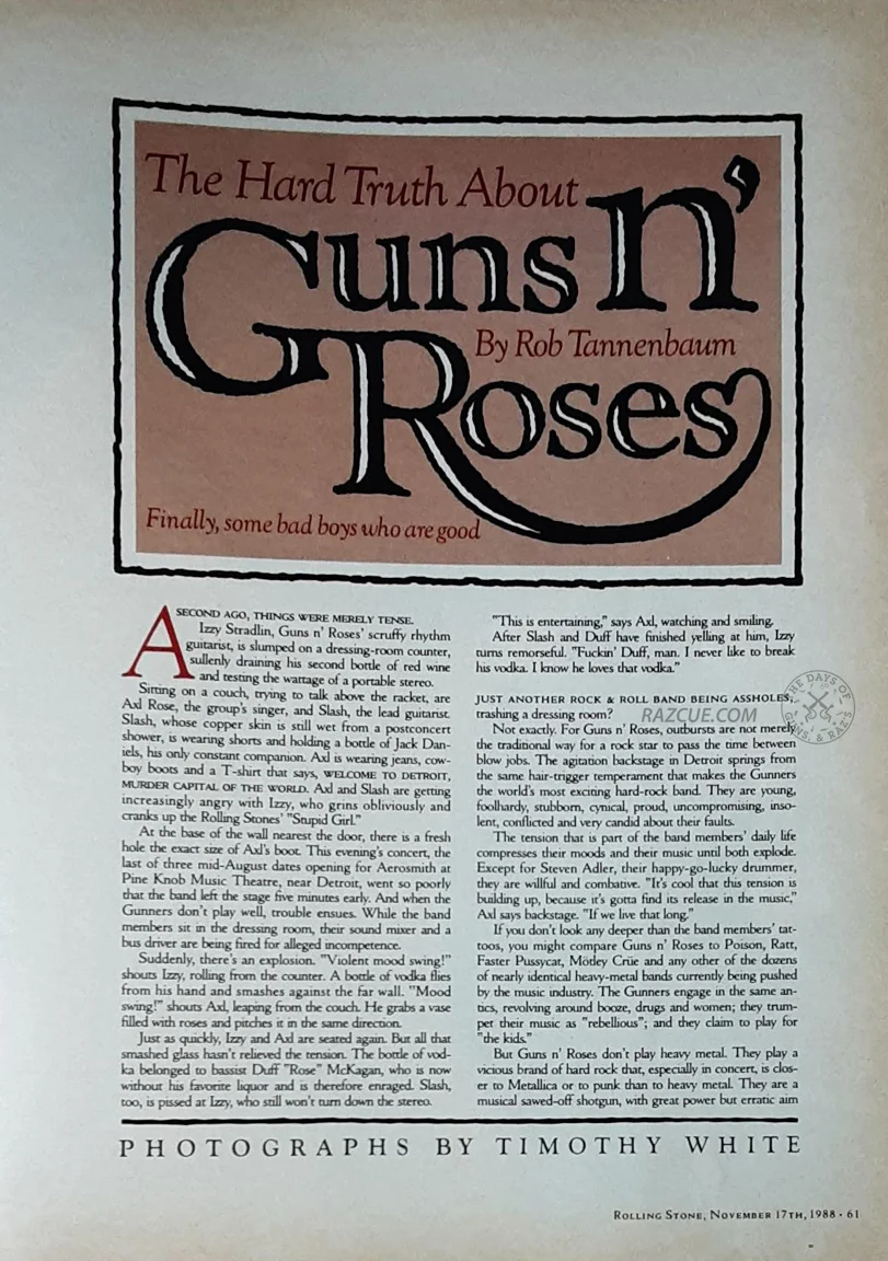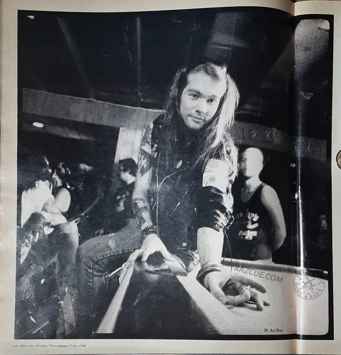 The bar, Mrs. Jay’s, sat right next door to the legendary Stone Pony club. Everyone was super cool to us, and without a doubt, a good time was had by all. The place was closed, but about fifty cool biker regulars remained within. Even though I repeatedly asked random strangers, “You got any hard drugs?” unfortunately no one had any blow to share. After all the travel, trouble, and Timothy touting the unique backgrounds that Mrs. Jay’s provided, the Rolling Stone spread only used two close-up shots from the location: one of Axl, and another of Slash on a pool table. Who knew there were no pool tables in Teaneck, New Jersey?