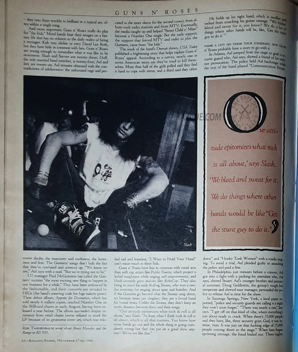 When I didn’t hear back from Axl for a month, I figured he forgot and the show had passed. But within days of that thought, he rang me up. After chatting for a while, he told me that indeed they would play a show with Deep Purple at Giants Stadium a few weeks down the line. I told him I’d call him back after checking on hotels and flights, so he could put me on the guest list if need be. I hadn’t realized he was calling me from Cincinnati. I was even more surprised when he gave me their travel agent’s number so I could pick up my complimentary plane tickets. Five days, later Appetite for Destruction hit # 1 on the Billboard charts for the first time.